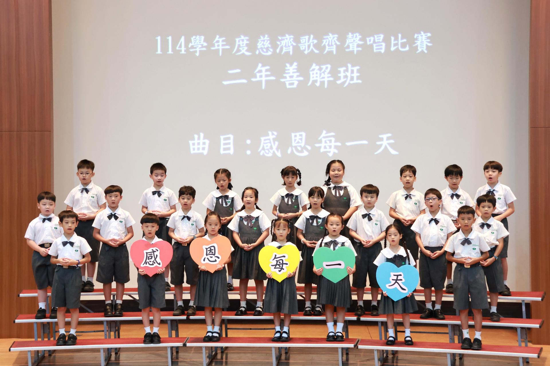 二年級演唱〈學點頭 學低頭〉、〈聽我說謝謝你〉、〈感恩每一天〉與〈幸福的臉〉等曲目,颱風後的花蓮災情慘重,有許多的鏟子超人、雨鞋超人到了光復鄉支援救災行動,而身在臺南慈小的我們,透過歌唱將祝福傳遞到遠方。