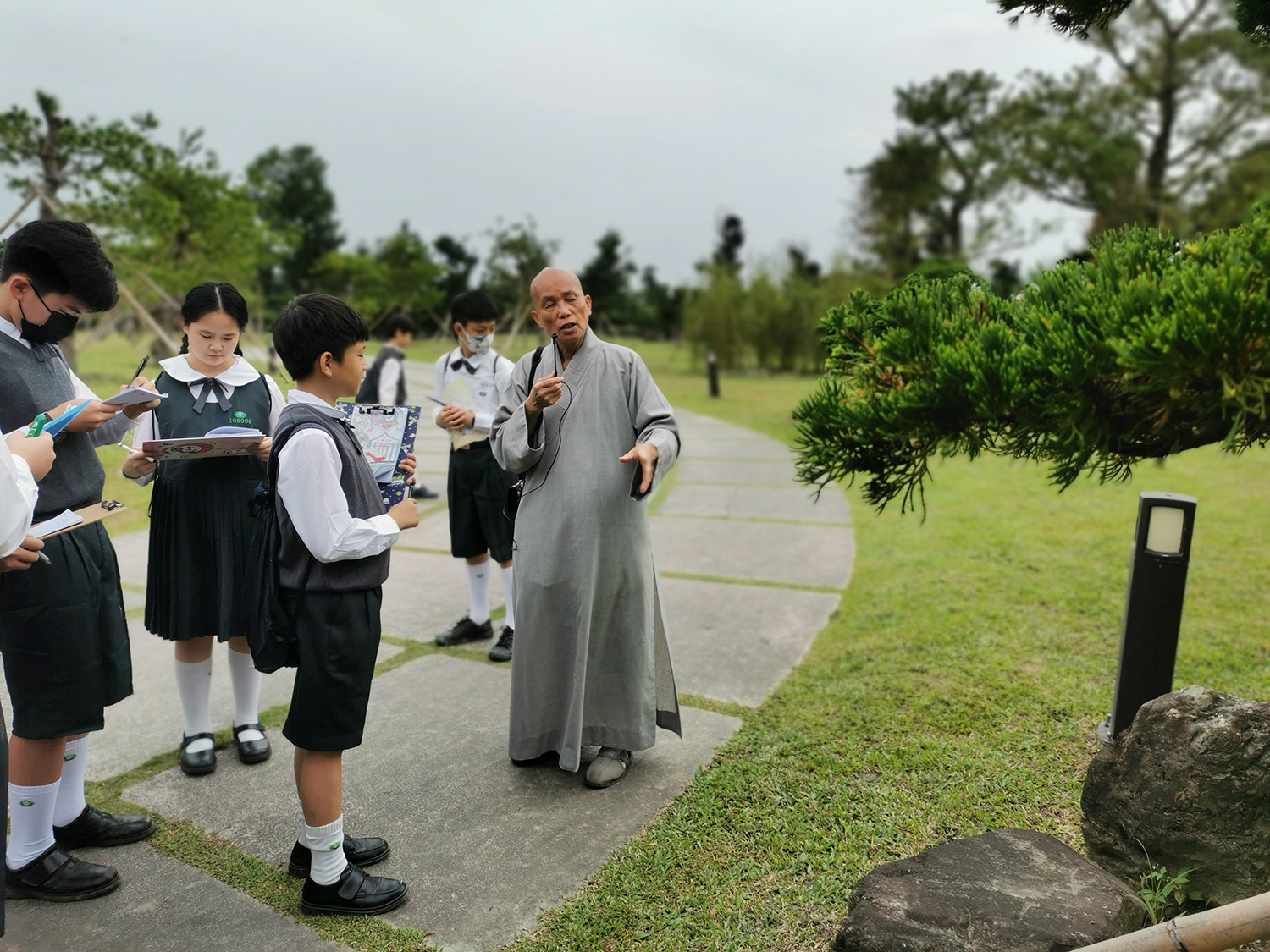行程第二天上午,學生正式踏上回到心靈故鄉的旅程,來到靜思精舍。第一站由德瑔師父親自帶領學生認識精舍園區的植物,並動手採摘月亮玫瑰與金銀花。德瑔師父與吳尚儒師兄詳細講解植物的特色、功效及如何萃取製作成珍貴的精油,孩子們現場品嘗清香甘潤的金銀花茶,從自然中體會療癒身心的力量,感受大地無私的供養。隨後,由德安師父、德念師父、德根師父與德椏師父分別帶領四個班級進行精舍導覽,介紹慈濟功德會的發祥地與草創歷程。師父們分享精舍「一日不作,一日不食」的精神,說明如何以儉樸踏實的生活方式,自力更生、節用資源、愛惜物命。孩子們在靜謐的環境中,深刻感受慈濟人文精神如何如蓮花連蒂並生,從一念善心開展至全球,影響無數生命。