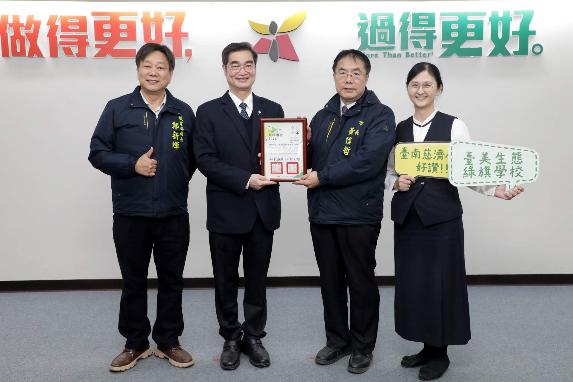 其中,顏秀雯主任長期擔任校內環境教育推動與整合的重要角色,曾獲環境部遴選,赴北愛爾蘭進行環境教育與生態學校交流,將國際經驗帶回校園,轉化為符合在地需求的教學設計與行動策略。顏主任以專業引領教師團隊,結合制度建構、教師專業成長與學生參與,成功帶領學校榮獲第二面臺美生態綠旗,並於此次市府表揚中獲得個人獎項肯定,展現「專業領航 × 團隊共好」的環教實踐典範。
