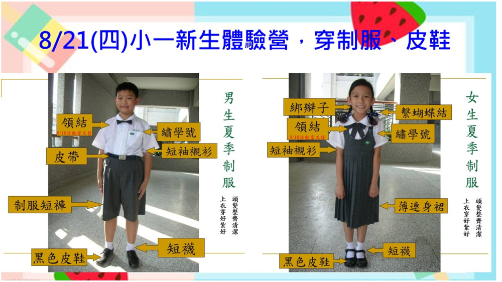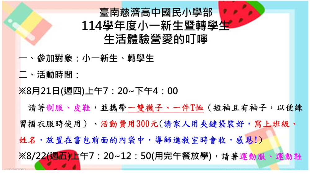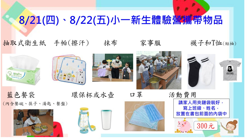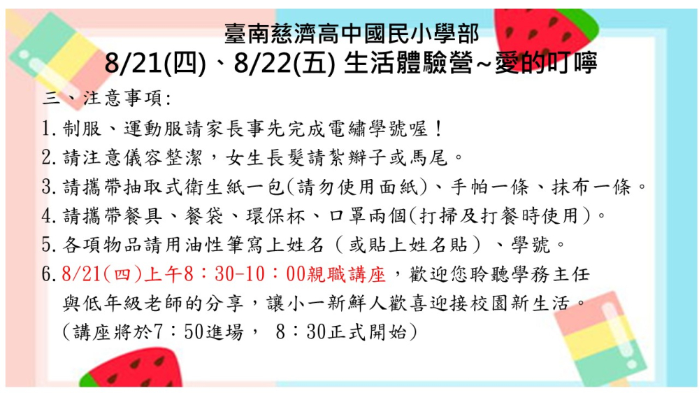 【公告】8/21-8/22小一新生暨轉學生《生活體驗營》愛的叮嚀