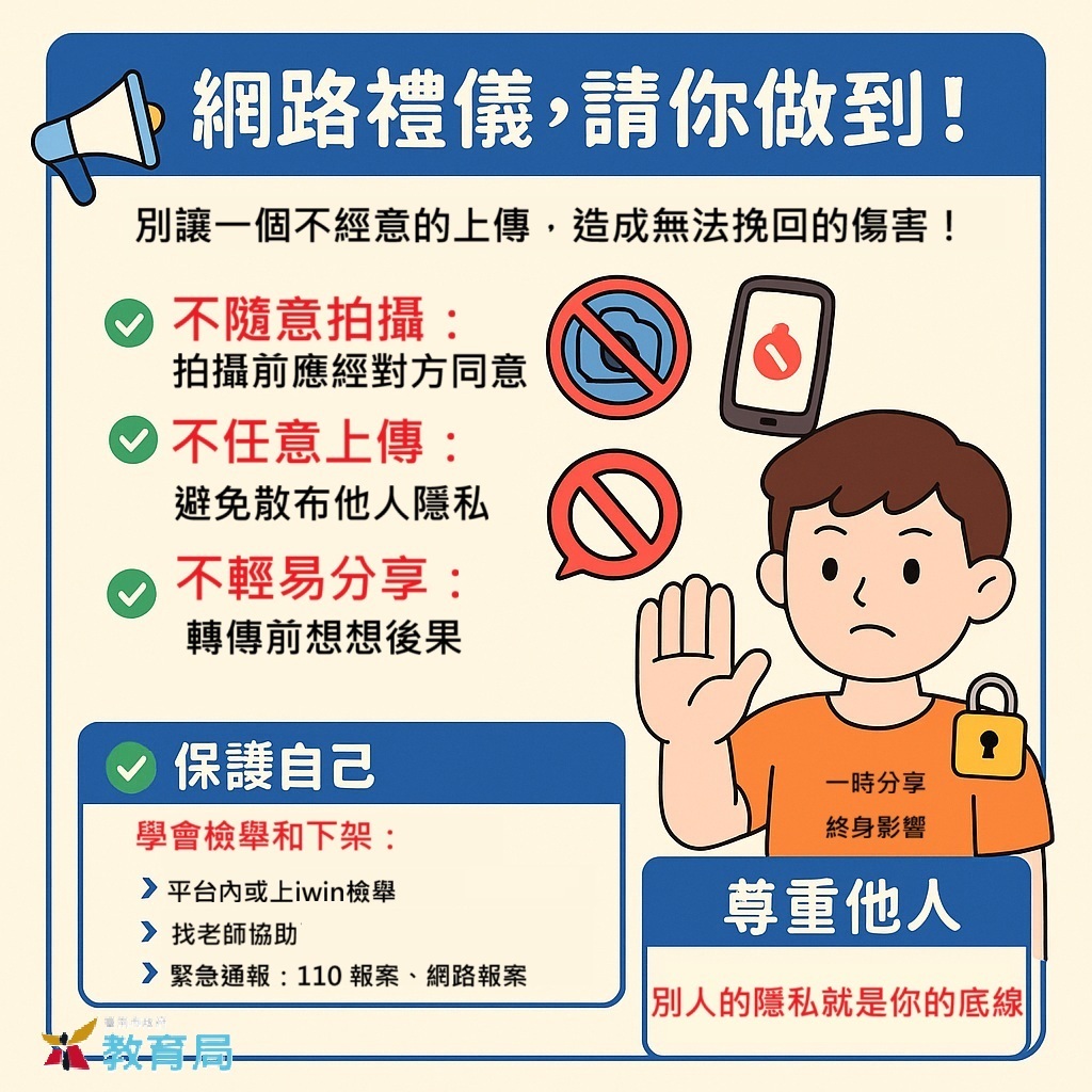 近期因部分學校的學生不當上傳自攝影像,引發各界關注,臺南市教育局特製作「網路禮儀宣導圖」,提醒大家在網路世界也需守法、守禮。 敬請全校師生一同遵守網路禮儀,建立健康、友善的數位學習環境。