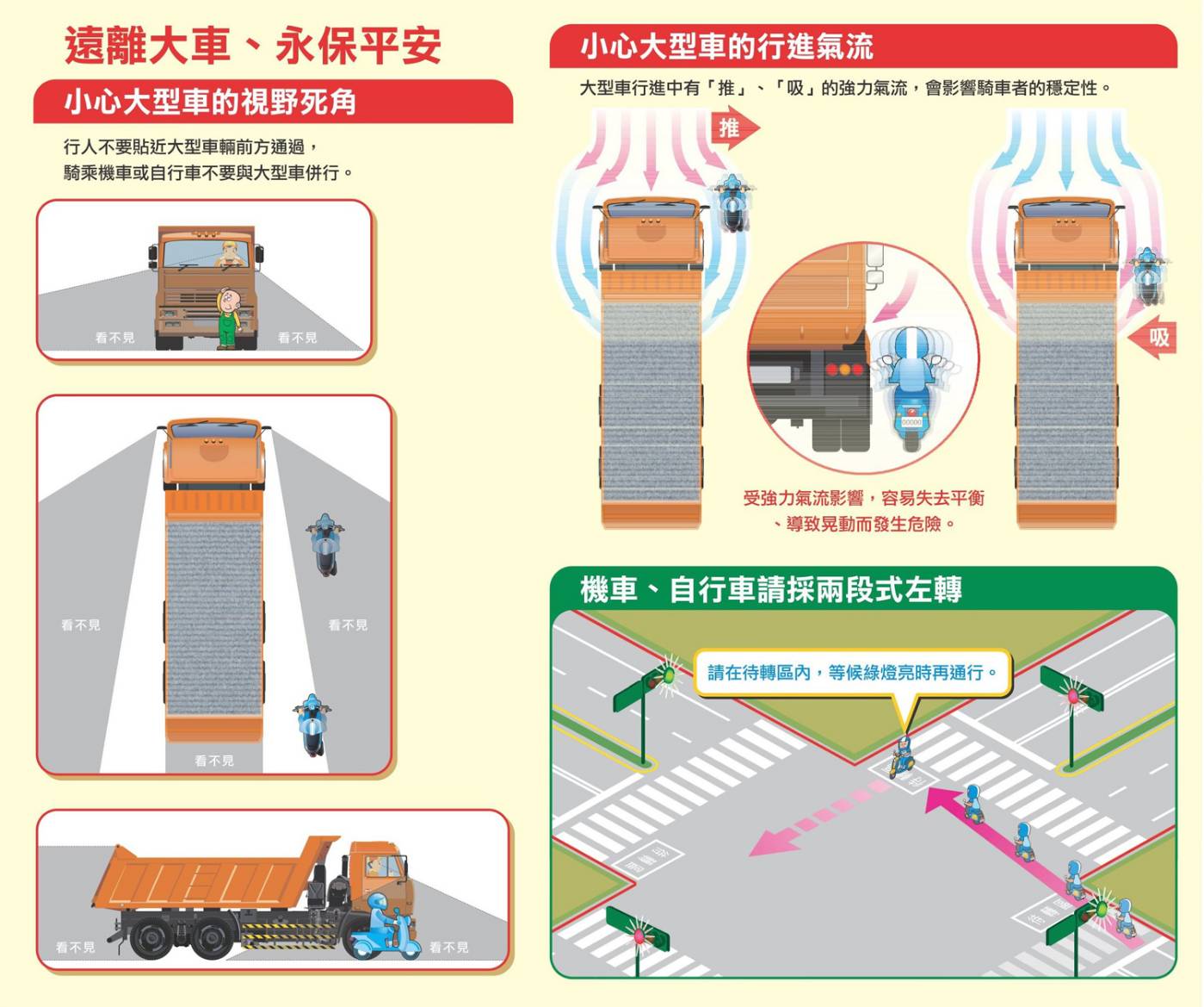 2、遠離大型車且勿與之併行,以防止內輪差及視線死角之交通意外。