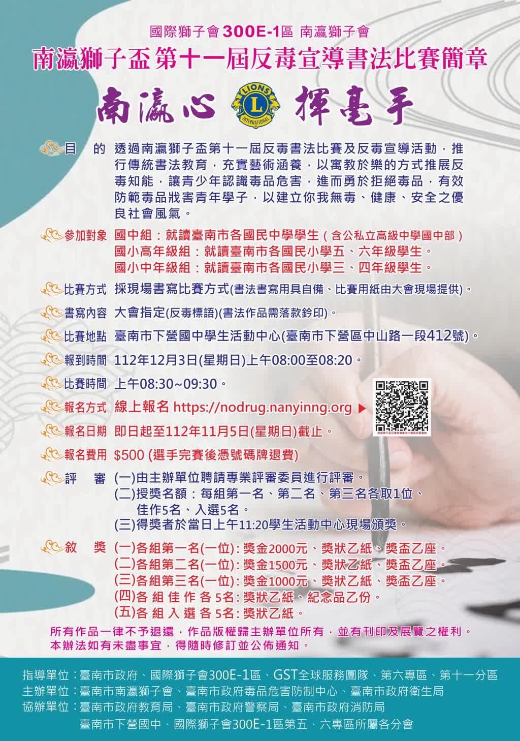 1、為推行傳統書法教育,充實學生藝術涵養,以寓教於樂的方式推展反毒知能,讓青少年認識毒品危害,進而勇於拒絕毒品,本局特與臺南市南瀛獅子會合作辦理旨揭比賽。