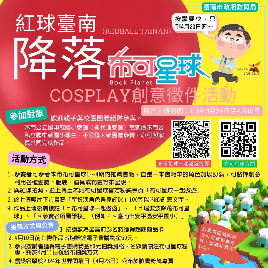 (二)至「紅球臺南RedBall Tainan」的展覽地(請詳官網:https://www.facebook.com/redballtainan2024/),與紅球拍照,並上傳至本局布可星球官方粉絲專頁「布可星球一起遨遊」。