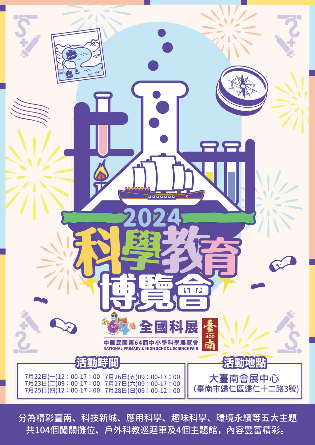 1.博覽會內容:分為精彩臺南、科技新城、應用科學、趣味科學、環境永續五大主題,共規劃104個闖關攤位、戶外科教巡迴車及4個主題館,內容豐富精彩。