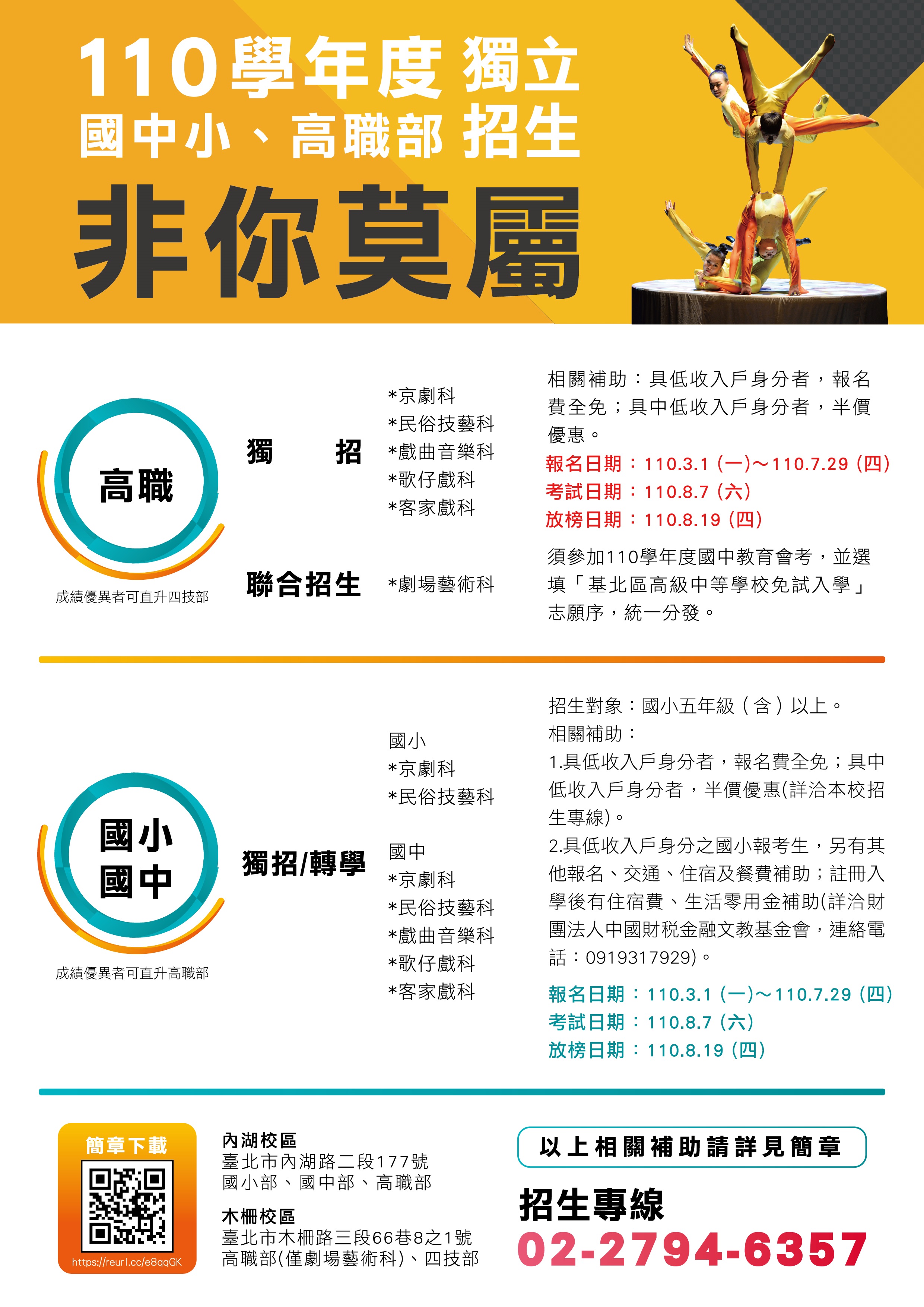 轉知國立臺灣戲曲學院110學年度國民中小學及高職三個部別獨立招生、轉學考及高職聯合招生訊息