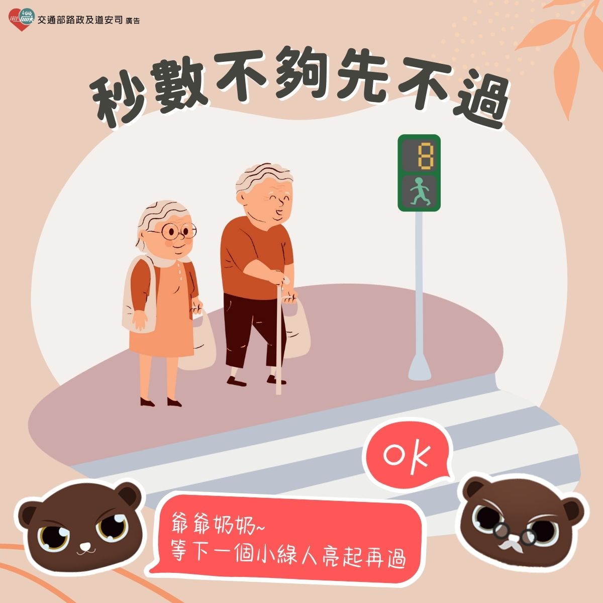1、本次宣導主題:「長輩早起散步過馬路,小綠人秒數不夠先不過!」。